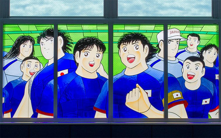 この巨大なステンドグラスは、高橋陽一氏ご自身が原画と監修を担当され、「クレアーレ熱海ゆがわら工房」の職人が製作しました。作品のモチーフは、世界的に大きな影響を与え続ける漫画『キャプテン翼』に登場する、大空翼とその他のキャラクターです。