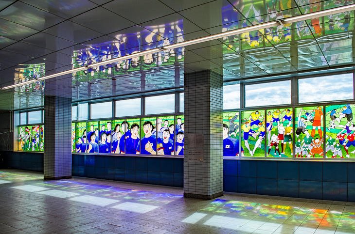 『キャプテン翼』のステンドグラスは、浦和美園駅のコンコース階に設置されています。