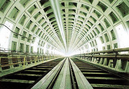 シールド工法は、駅間工事のほとんどに採用されている直径10mからなるシールドマシーンと呼ばれる機械で、地中深く水平に掘り進む、いわゆるもぐら工法のことです。この工法は、あらかじめ工場でつくったセグメントと呼ばれるコンクリートブロックで覆い、トンネルを完成させていく方法です。地表面に影響がほとんど無く、安全に工事が進められるという利点があります。