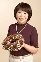 かわいらしい木の実に一つ一つワイヤーをかけ、装飾ワイヤーやパールやビーズを作ってかわいらしい花を作る。