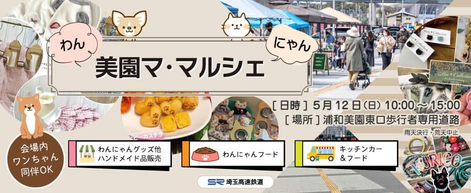 浦和美園をもっと楽しく!ママクリエイターが集まり開催する「美園マ・マルシェ」のスピンオフイベント。今回は初の「美園わん・にゃんマ・マルシェ」を開催! わん・にゃん雑貨におやつにお洋服販売、飼い主さんも嬉しい美味しいキッチンカーなど約30ブースが勢ぞろいします。