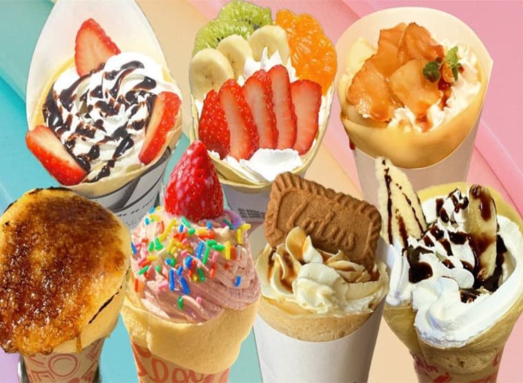 クレープ、クロッフル、ドリンク、アイスパフェ