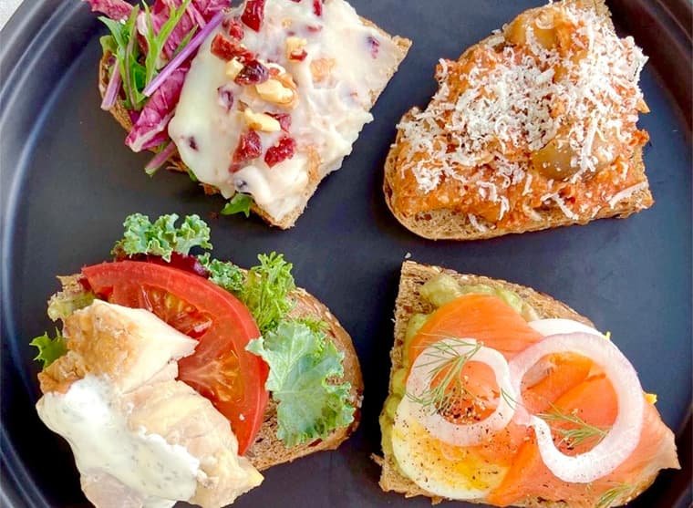 オープンサンド、ローストビーフ丼、ローストポーク丼、グリルチキン丼、ドリンク各種、自家製シロップのフルーツソーダ、かき氷