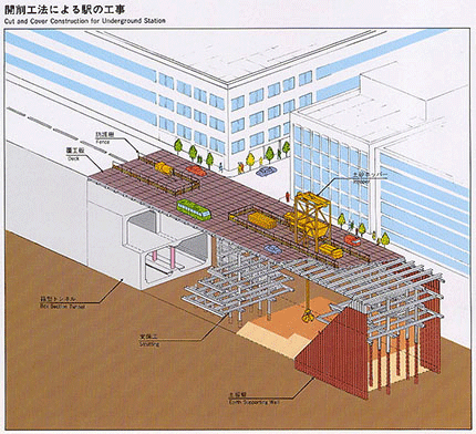 開削工法は、掘削深さが比較的浅い場合や、形状の複雑な駅部などに採用されます。この工法は、トンネルの両側に鋼杭あるいはコンクリート製の土留壁と呼ばれる壁をつくり、覆工板でふたをして交通に支障の無いようにしてから掘り始めます。上下水道、ガス等の埋設物を厳重に防護しながら、必要な深さまで掘り下げ、箱型のトンネルを築造する方法です。