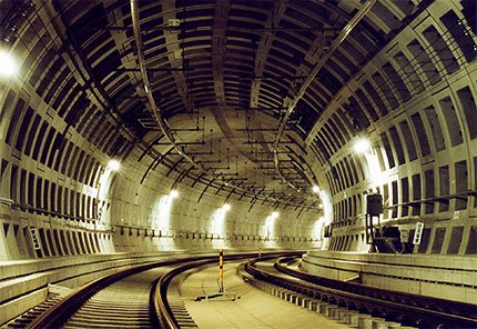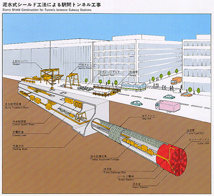シールド工法は、駅間工事のほとんどに採用されている直径10mからなるシールドマシーンと呼ばれる機械で、地中深く水平に掘り進む、いわゆるもぐら工法のことです。この工法は、あらかじめ工場でつくったセグメントと呼ばれるコンクリートブロックで覆い、トンネルを完成させていく方法です。地表面に影響がほとんど無く、安全に工事が進められるという利点があります。