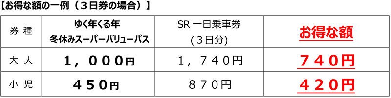 ・ 小児 450円(SR 一日乗車券3日分より420円おトク)