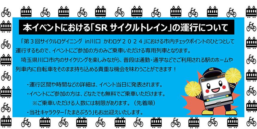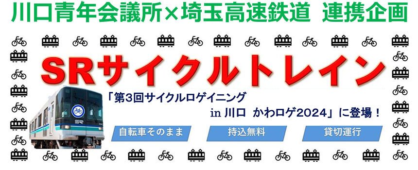 埼⽟⾼速鉄道株式会社(さいたま市緑区 代表取締役社⻑:平野 邦彦)では、公益社団法人川口青年会議所が主催するイベント「第3回サイクルロゲイニング in川口 かわロゲ2024」に協力し、自転車ごとそのままご乗車いただける「SRサイクルトレイン」を運行いたします。
