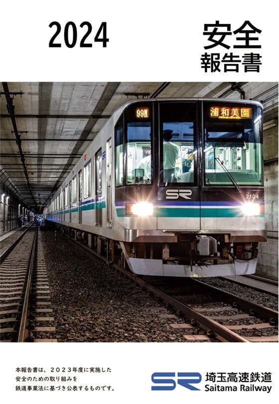 日頃より、埼玉高速鉄道埼玉スタジアム線をご利用いただき、誠にありがとうございます。この度、鉄道事業法第19条の4に基づき、2024 安全報告書を公表いたします。この安全報告書は、令和5年度に実施した安全のための取り組みをまとめたものです。引き続き社員一丸となり、安全・安定輸送に努めてまいりますので、今後とも皆様のお引き立てを賜りますよう、お願い申し上げます。