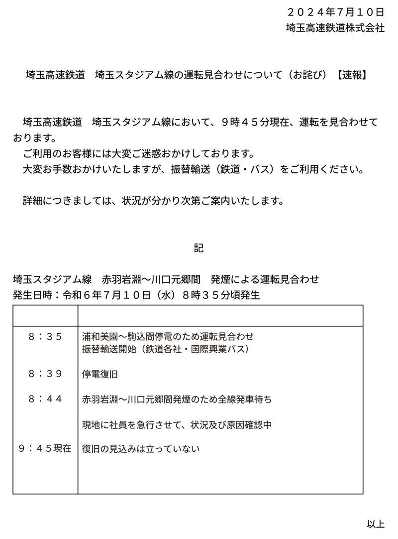 埼玉高速鉄道 埼玉スタジアム線の運転見合わせについて(お詫び)【速報】