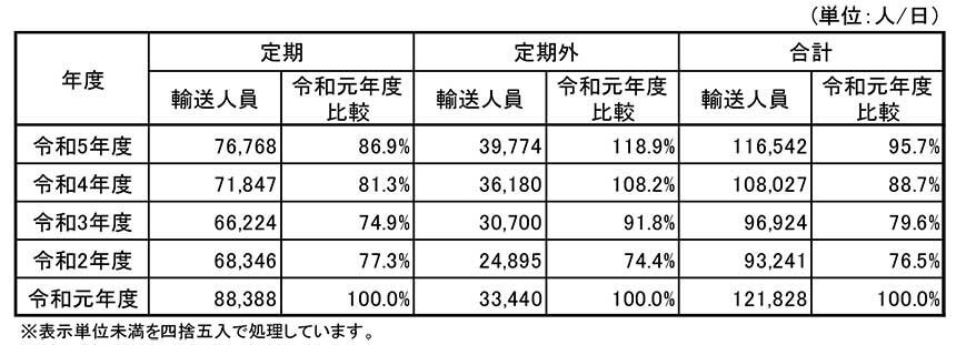 令和5年度は新型コロナウイルス感染症が感染症法上の5類扱いになり、人流の戻りが進んだこと等により、1日当たりの輸送人員は、116,542人(前年度比8,515人増、7.9%増)となりました。輸送人員の推移については、以下のとおりです。