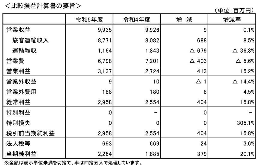 旅客運輸収入は、輸送人員の回復により、87億71百万円(前期比6億88百万円増、8.5%増)となりました。なお、令和元年度と比較した回復率は97.0%となりました。テレワークの定着など働き方の変化等により、定期から定期外へ一定程度シフトした状況も見られますが、着実に回復しております。 営業利益は31億37百万円(前年度比4億13百万円増、15.2%増)、経常利益は29億58百万円(前年度比4億4百万円増、15.8%増)、当期純利益は22億64百万円(前期比3億79百万円増、20.1%増)を計上し、黒字を積み増すことができました。