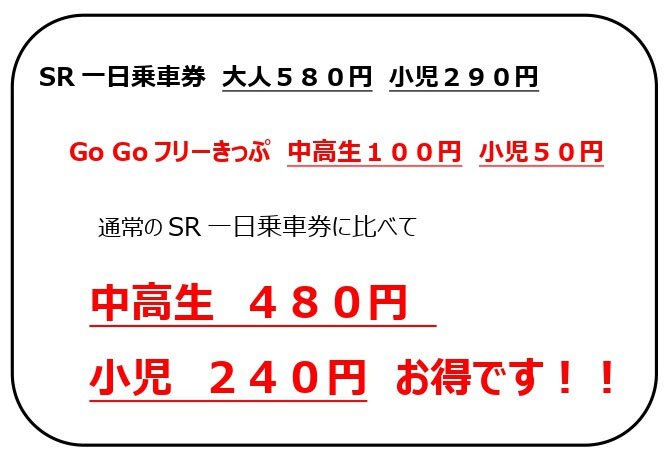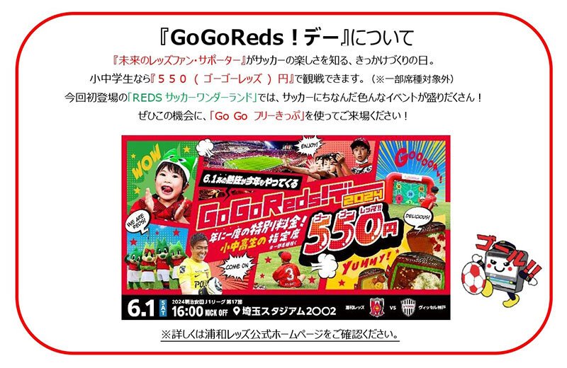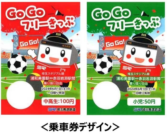 埼⽟⾼速鉄道株式会社(さいたま市緑区 代表取締役社⻑:荻野 洋)では、浦和レッズが6月1日(土)のホーム開催試合において、「未来のレッズファン・サポーターに、サッカーの楽しさを知ってほしい」という願いを込めて、小中⾼生の観戦料を550円とするキャンペーン「GoGoReds!デー」を昨年に続き実施することを受け、キャンペーンの対象となる小中⾼生のお客様向けにお得な乗車券「Go Goフリーきっぷ」を数量限定で発売いたします。この乗車券は、埼玉スタジアム線全線が1日乗り放題で中高生100円、小児50円と通常のSR一日乗車券より大幅に割引した、大変お得な乗車券となっております。