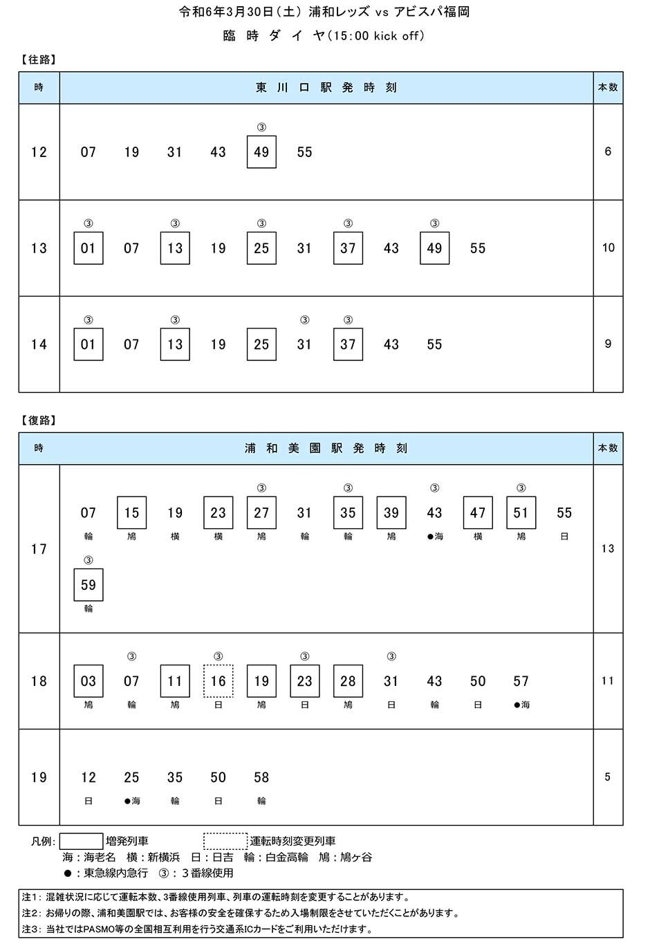 3月30日(土)15:00より、埼玉スタジアム2002にて浦和レッズ v s アビスパ福岡の試合が行われます。 埼玉高速鉄道では、試合開催当日、混雑時間帯に臨時列車を設けるとともに、安全・安心してご利用いただけるよう、万全の体制にてお客様をお迎えいたします。 ご利用の際は、東川口駅・浦和美園駅のきっぷうりばは混雑が予想されますので、事前のICカードへのチャージや乗車券の購入にご協力をお願いいたします。