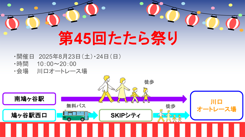 また、たたら祭りの会場となる川口オートレース場は、南鳩ヶ谷駅が最寄となるほか、鳩ヶ谷駅西口からSKIPシティまでの無料のシャトルバスが運行され、当社線からのアクセスも大変良好です。