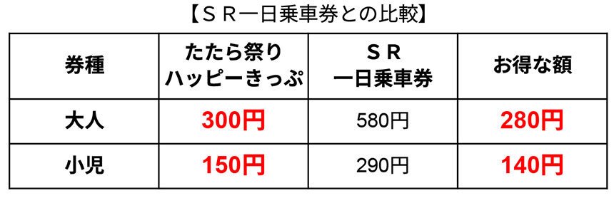 この乗車券は、昨年に引き続き、今年も埼玉スタジアム線全線1日乗り放題で大人300円、小児150円と、通常のSR一日乗車券より大人280円、小児140円もお得にご利用いただけます。