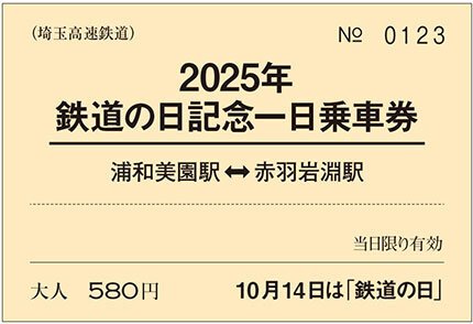 埼玉高速鉄道株式会社(埼玉県さいたま市 代表取締役社長 平野 邦彦)では、10月14日の「鉄道の日」を記念し、「2025年鉄道の日記念一日乗車券」を限定 1,000枚で発売いたします。