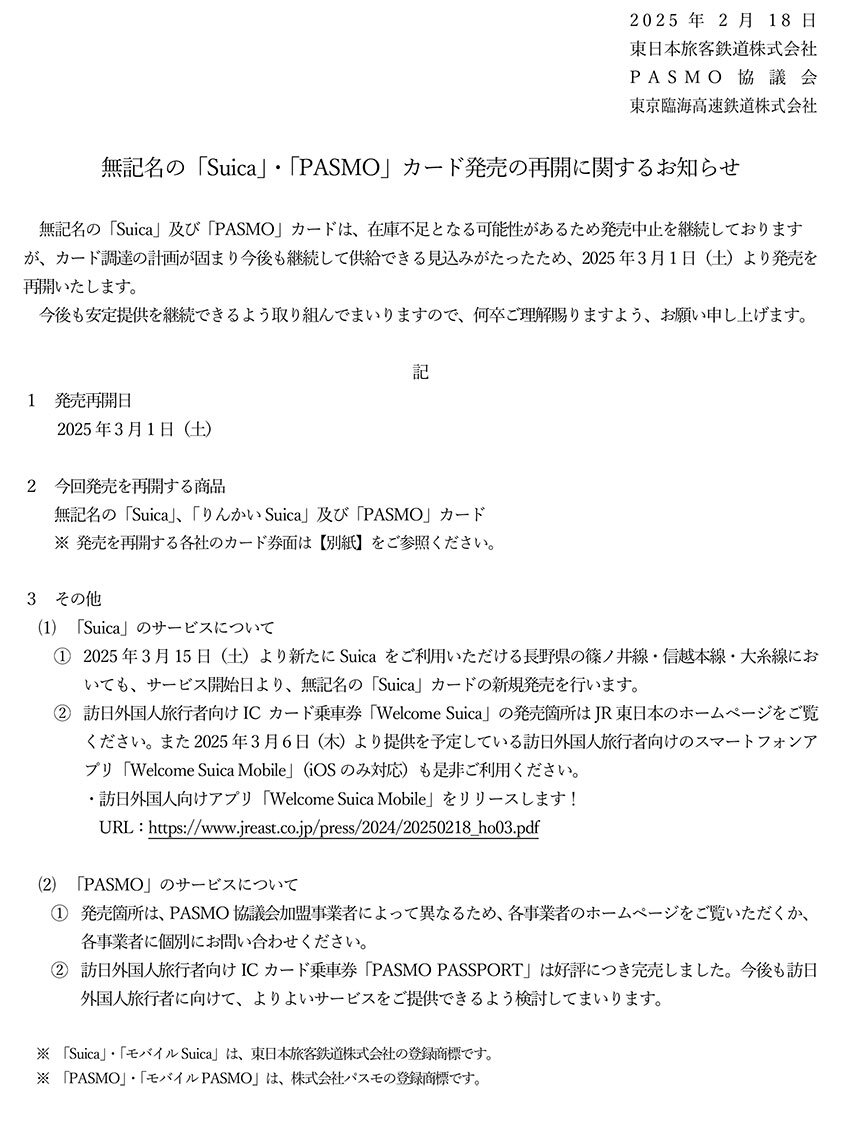 無記名の「Suica」・「PASMO」カード発売の再開に関するお知らせ