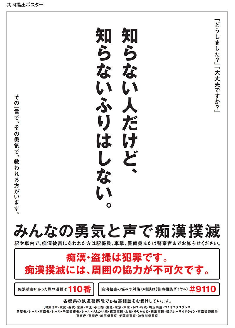 (参 考)警視庁の取り組みについて 警視庁では、期間中、東京都、鉄道事業者等と協働で痴漢撲滅対策を実施します。 また、警視庁防犯アプリ「デジポリス」を開発しており、本アプリには痴漢撃退機能があります。痴漢被害に声をあげられなくても「痴漢です 助けてください」の表示画面で周りの人に助けを求めること等が可能です。