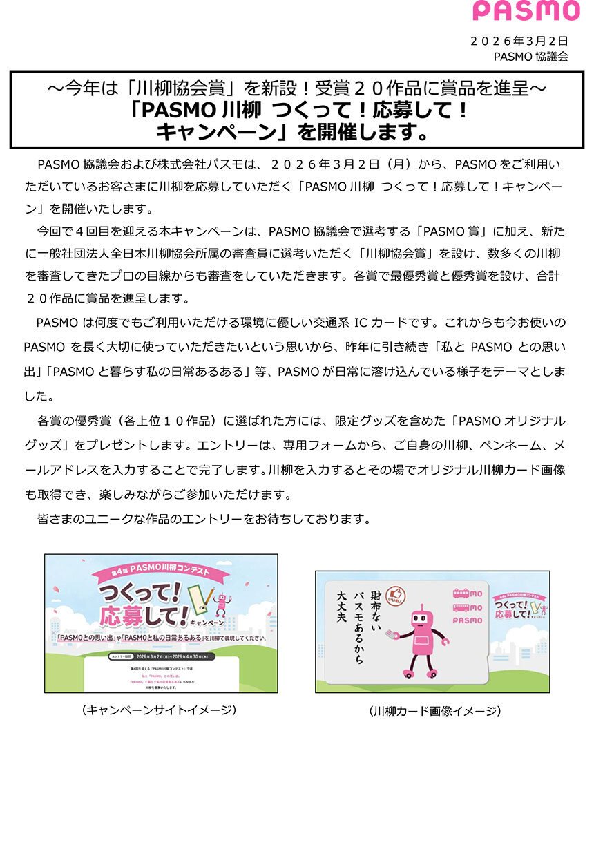 2026年3月 2日 ~今年は「川柳協会賞」を新設!受賞20作品に賞品を進呈~ 「PASMO川柳 つくって!応募して! キャンペーン」を開催します。 関連PDF報道機関向けプレスリリース (PDF:559.5 KB)