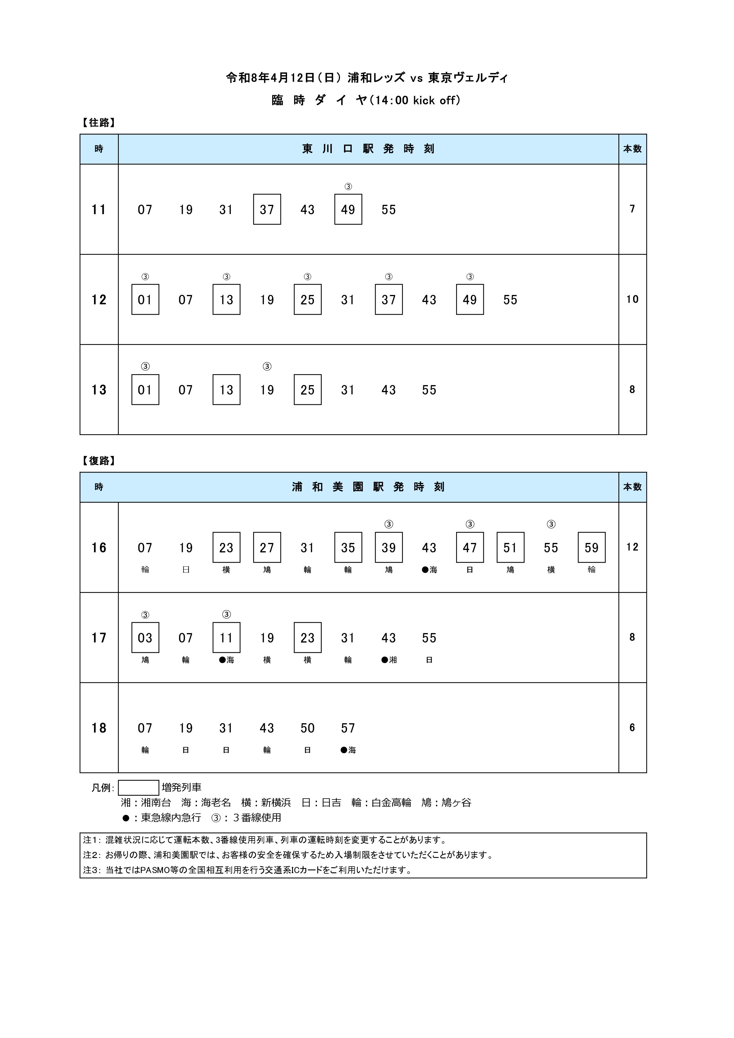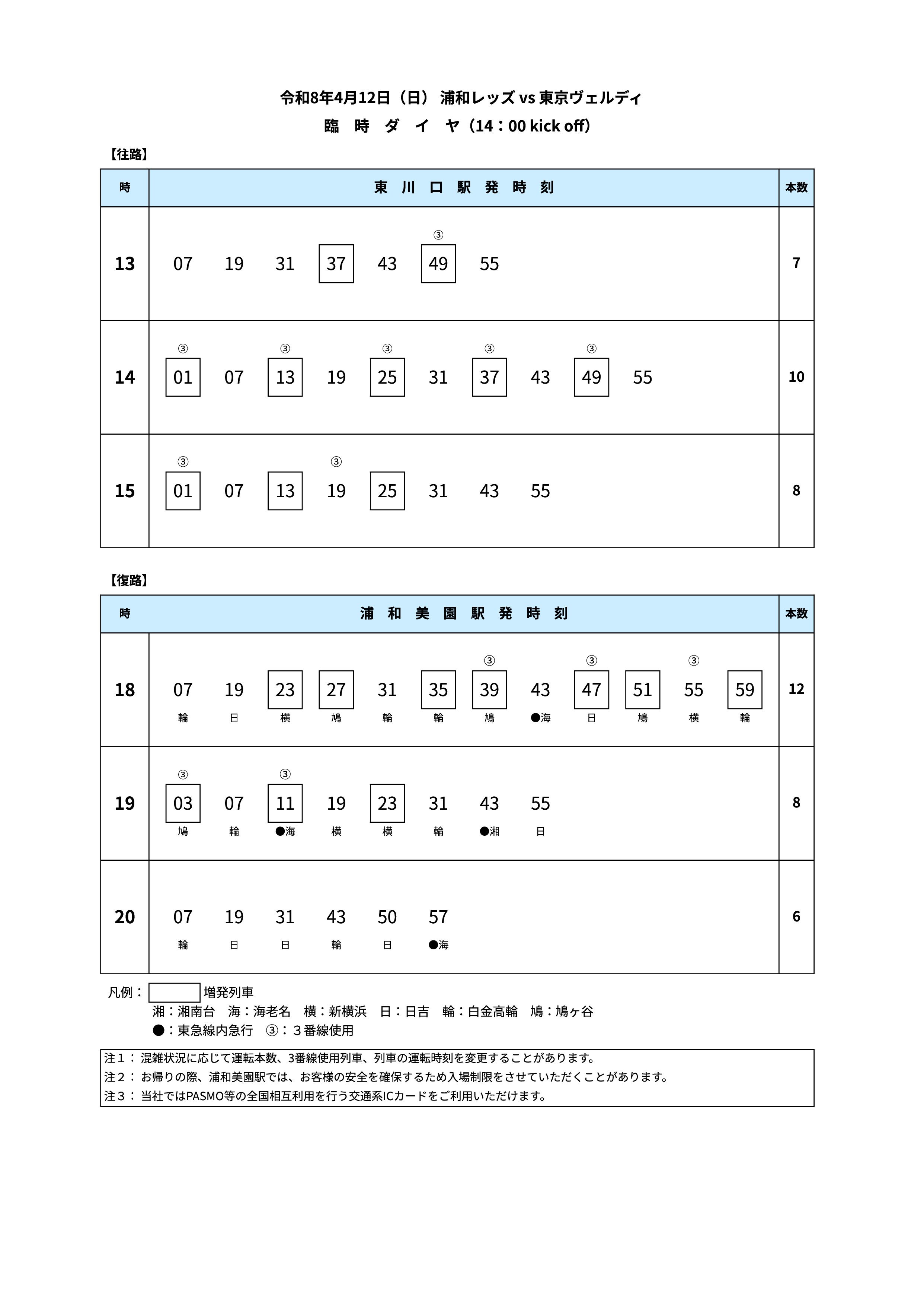 令和8年4月12日(日)浦和レッズ v s 東京ヴェルディ 臨時ダイヤのご案内