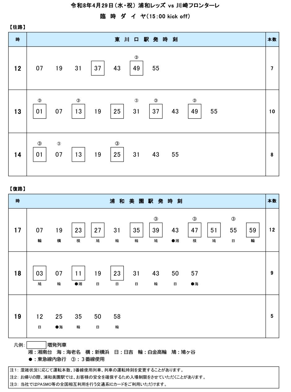 令和8年4月29日(水・祝)浦和レッズ v s 川崎フロンターレ 臨時ダイヤのご案内