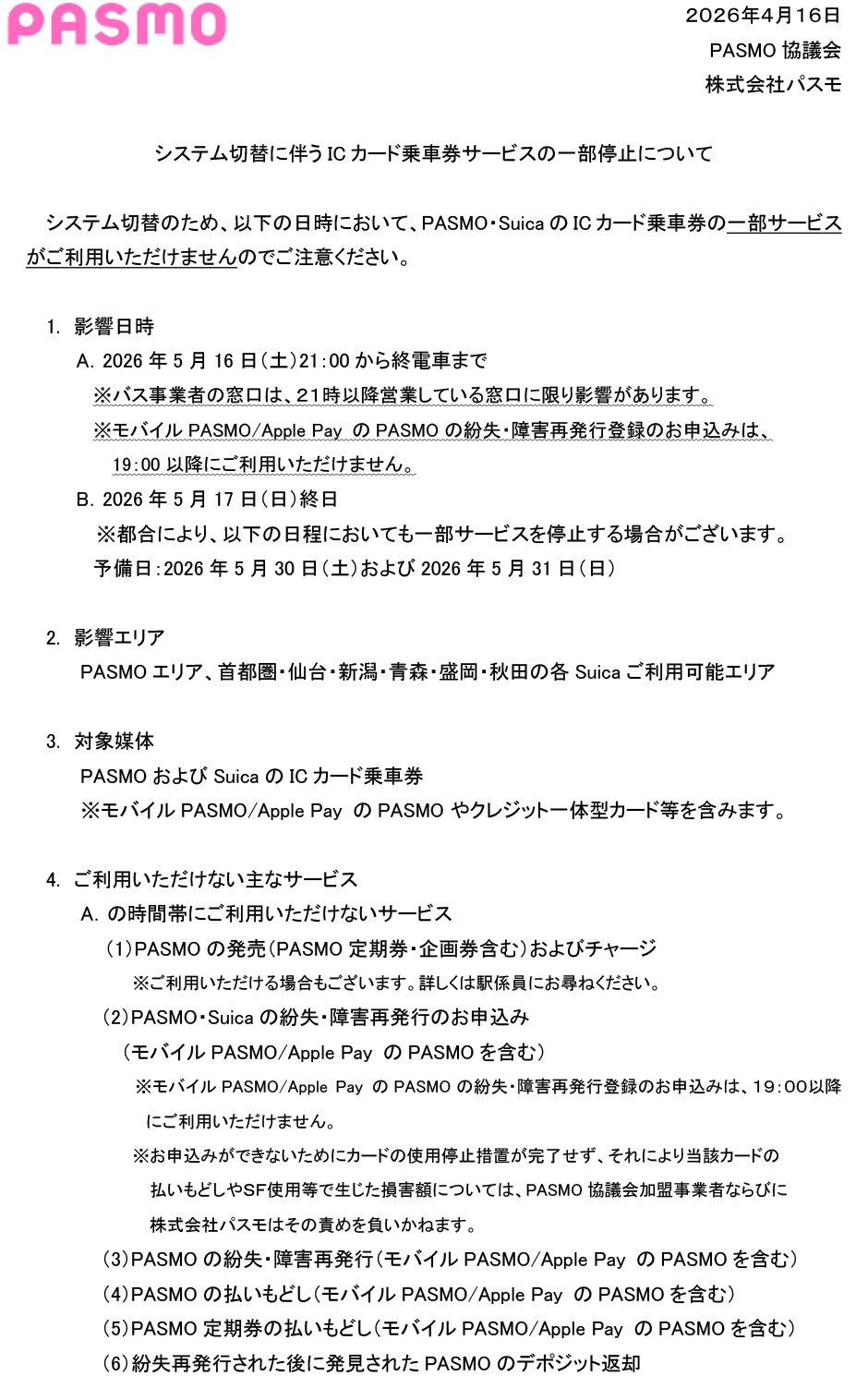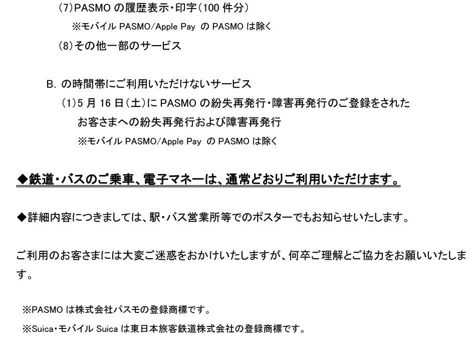 システム切替に伴うICカード乗車券サービスの一部停止について(PASMO協議会)