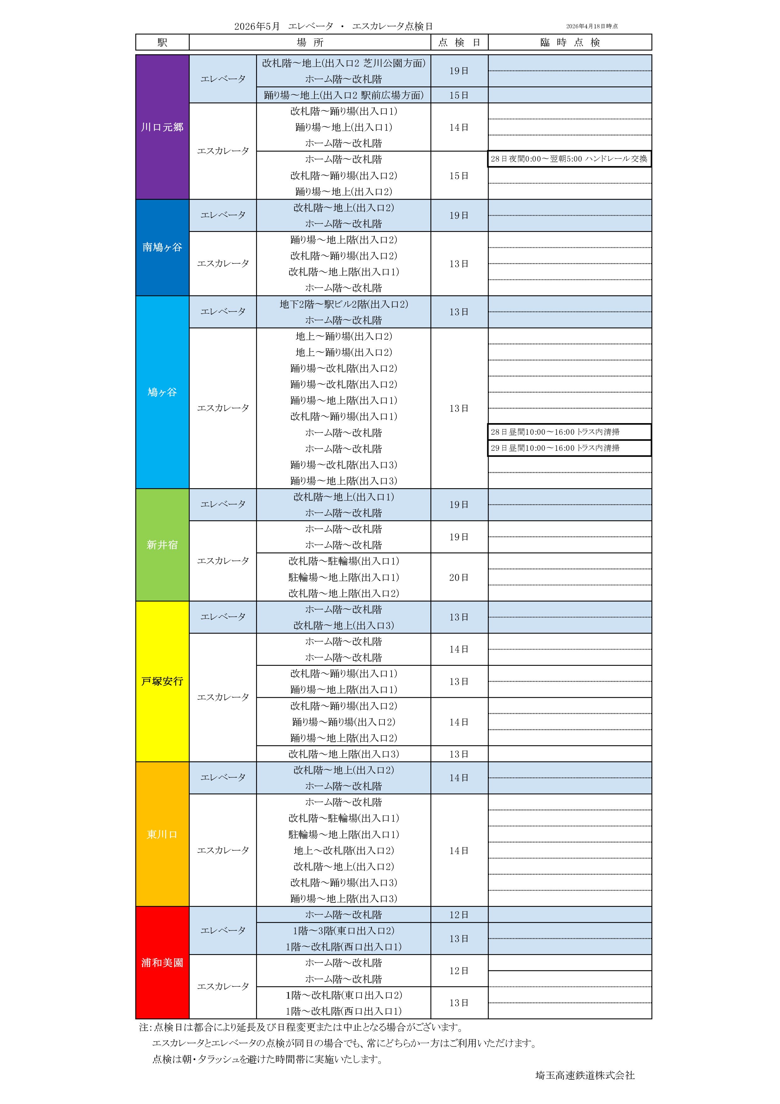 エレベータ・エスカレータ定期点検のお知らせ(2026年5月)