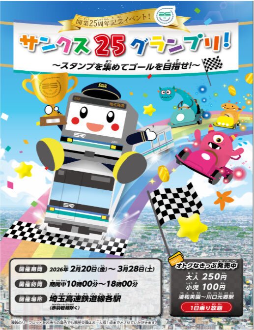 埼玉高速鉄道株式会社(さいたま市緑区 代表取締役社長 平野 邦彦)では、当社の開業25周年を記念して周遊型イベント「サンクス25グランプリ」を開催いたします。本イベントは当社駅員が企画し、ご好評をいただいている第6弾となる周遊型イベントです。